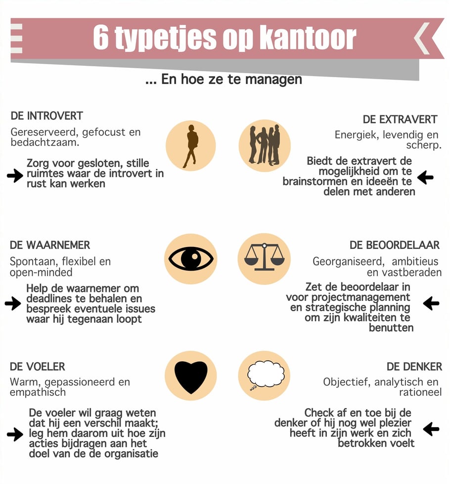 We kennen ze allemaal wel: bepaalde types op de werkvloer. Vooral wanneer je bij een groot bedrijf werkzaam bent zul je (een of meerdere) van deze types herkennen. Stop ze absoluut niet in een hokje, maar weet als manager wel hoe je de bepaalde types het beste kunt benaderen. Wij zetten er 6 voor je op een rij in deze infographic: